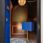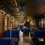 Building upon the success of their first bar/restaurant project, Copycat Co. in the H Street Corridor, Devin Gong and his team bring their passion and artistry of craft cocktails to Dupont Circle with this luxurious-yet-comfortable hangout. Astoria’s design inspiration emerged from several sources, including its namesake, New York’s first self-made millionaire J.J. Astor. Borne from Gong’s childhood love of trains, Astoria fuses together the design of Astor’s New York City with luxury of The Orient Express trains, where comfort and amenities were integral to the guest experience. Additionally, the combination of French motifs and Chinese elements inspired a contrasting blend of refined and industrial architectural features and materials. Astoria features a fully renovated historic storefront and a visually stunning interior. Upon entering the bar, guests are transported into the glamorous world of Victorian-era train travel and old-world New York. The design embraces the building’s narrow architecture to focus linear views and sightlines that play up train-like similarities. For example, the curvature of Victorian-era train car ceilings served as inspiration for the custom curved metal lattice layered over the exposed brick wall to form a dramatic pathway. Velvet booths for cocktail service, reminiscent of luxurious train compartments, line the walls leading to the bar. Seating in the back provides a more intimate setting, and includes an elevated, semi-private booth with train-inspired flip-down seats. The varied seating enables guests to be part of the bar activity or nestle into a more quiet nook with friends. Many elements of accommodation, such as coat hooks and phone-charging stations, are conveniently organized within the booths, as one might find such personal features on a train. The service bar is the shimmering heart of Astoria, with its ornate tile and brass accents that you discover as you walk deeper into the space. The bar’s façade features Astoria’s name in custom blue, white, and gold mosaics, inspired by New York subway tilework. The overhead bottle display draws inspiration from the brass railing found in the bygone Waldorf Astoria Hotel. Two small marble peninsulas at each end of the bar seat two people each, who can watch the bartenders craft beverages. Adjacent bar-height tables provide guests with a “chef’s table” experience nearby. Composed of a simple palette of French blue, white, mahogany tones, and brass, Gong and the design team co-created a visually stunning and harmonious design from its diverse sources of inspiration. The main floor is dedicated to guest seating and features an efficient cookline and food finishing equipment, while the basement is being used for food prep work and storage. Astoria offers guests an ever-changing selection of craft cocktails and a food menu that focuses on dumplings and pasta dishes influenced by Sichuan and Korean cuisine.