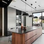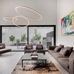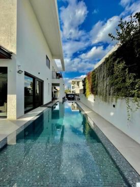 The living room is situated under the double-height space and overlooks the well-maintained garden, where the family and their guests can enjoy the swimming pool, outdoor kitchen, and dining and lounge areas. “Originally, there was a built-in TV wall planned there, which I insisted on opening to ventilate the space and provide an uninterrupted view from inside to the outdoor entertainment area and the pool. We opted for seating in a warm chocolate-brown shade that connects to the charcoal tones, and the straight lines break a minimalist abstract carpet underneath, complemented by a trio of delicate pendant lights in various sizes and angles, floating above. An original artwork by Kedishman hanging on the wall adds a burst of color, life, and humor.”