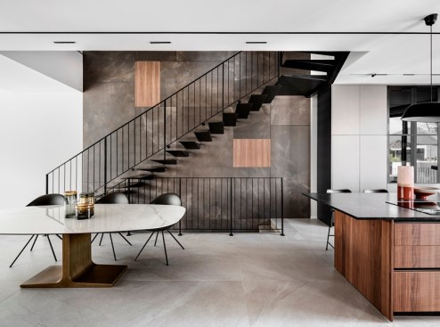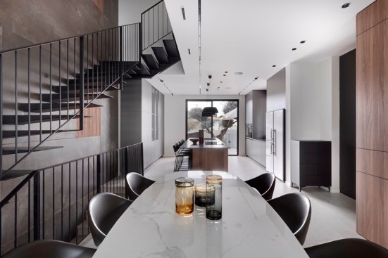 The original envelope of the project was updated, and Weinbren chose to soften the diagonal lines with minimalist, clean facades, free of decorative elements. Broad stone steps lead to the entrance, flanked by elegant dark planters among the embracing columns. With the opening of the impressive iron door, visitors enter an intimate entryway into the public space. Despite the rectangular structure, the house exudes a pleasant and airy atmosphere, thanks to thoughtful space allocation: “I tried to open up the floor as much as possible, avoiding elements that would obstruct the flow in the space,” explains Weinbren. “The three main functions—the kitchen, dining area, and living room—move on a continuous gradient, each receiving its characteristics, creating a conceptual division of separate yet interconnected experiential zones, especially in terms of material and color. Large openings in the living room and kitchen bring in abundant light and air, establishing an almost seamless connection with the outside. The architectural staircase, on one hand, is impressive and prominent, and on the other hand, occupies minimal space in the room. The guest bathroom defines the space with a porcelain-clad floating volume—material we used in other areas throughout the house.”