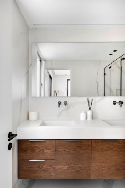“Even in the master bathroom, we used a light color palette: the walls are clad in large porcelain granite tiles with a natural marble pattern, and above the bathtub, we installed a double sink made of brushed cast aluminum. For the shower area, we created a particularly large shower with a built-in bench and niches, and we chose faucets in a brushed finish.”