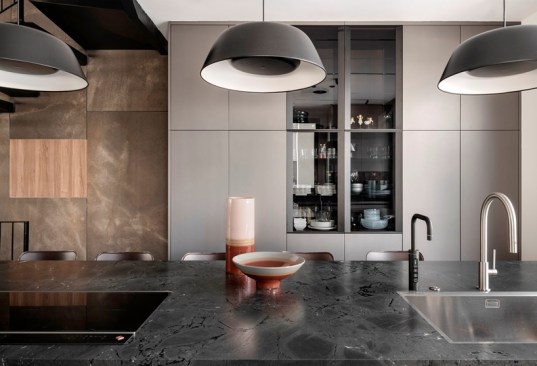 “I have been working with this couple for almost 25 years: I designed offices for them, their previous homes, and now their new home, which they purchased at the frame stage,” she recalls. “The house is part of a duplex structure in one of the best neighborhoods in the city, surrounded by a large inviting courtyard. Across the four levels, we created a spacious floor that includes shared living functions, an upper level with equipped children’s rooms, and a gallery floor dedicated to the couple.”