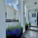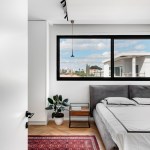 “Above the entrance floor is a gallery floor overlooking the living room and garden. Here, in addition to a spacious equipped guest bathroom, the master suite is located: ‘In contrast to most areas in the house, which were designed in relatively dark tones, the couple’s realm is exceptionally bright, creating a reflection of light and a very clean feeling. For the bedroom, we chose natural oak parquet in a herringbone pattern. We created a large wall-mounted wardrobe that combines light fronts with aluminum and glass fronts. Near the bed, there is an exit door to an intimate balcony overlooking the pool. The resulting look is modern but spiced with eclectic elements and greenery.”