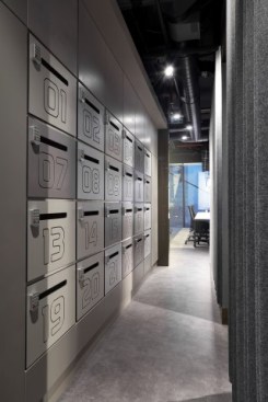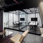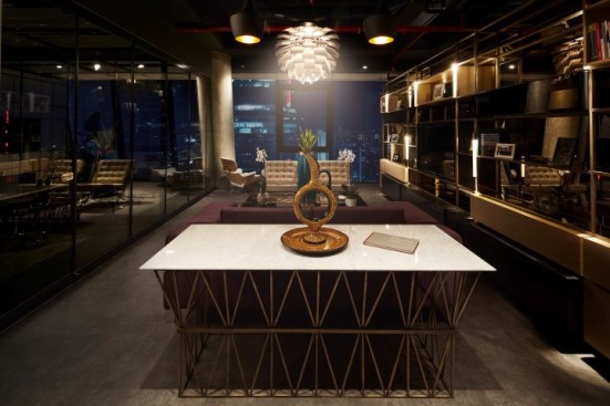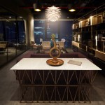 The design was started with the principle of interchangeability of the compartments and the suitability of the furniture for this mobility since there was not enough space to position the necessary functions. At the entrance and reception area, Iglo Architects were designed a large library and comfortable seating area with a warm atmosphere which is separated by a polished wooden library framed by a metal lattice on one side and a gigantic separator with linear illuminated file shelves in the niche formed on the other. This element separates the two spaces in style, atmosphere, light, and sound while connecting them with a smooth transition provided by its shell made of a bronze mirror place inside a metal cage.