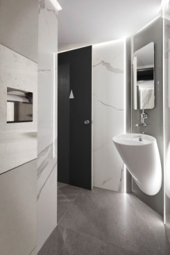 WC’s were positioned around the shaft in the space, an island was created. An acoustic conversation room and a storage area placed at one end of this island facing the working area, and an acoustic telephone booth placed at the other end, and all these volumes dressed with a preformed acoustic and decorative shell, resulting in a unitary and spatial form which gives the space its character.