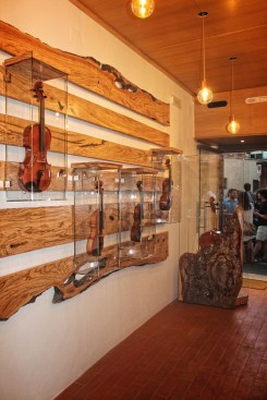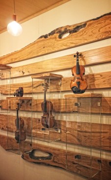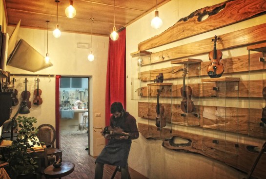 Studio Lauria has just completed the creation of a small but interesting and unique interior design project in Florence: the atelier of the young violinmaker Tommaso Pedani, heir of a centuries-old tradition started in Cremona by Antonio Stradivari. The atelier, located in the historic district “Le Cure”, opens onto the street through a large window that reveals the floor in terracotta planks and the wooden ceiling from which luminous globes of various sizes hang. Sound-absorbing panels have been fixed to the walls join to large olive-tree boards, shaped and worked to host the display box containing violins and violas. The use of wood characterizes the design of the interior space and recalls the work of cutting and engraving that the violinmaker carries out to obtain the harmonic box of the instruments.