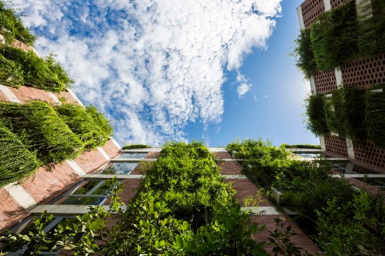 The building façade is clad with locally-sourced sandstone pieces used in combination with an exposed concrete slab and a series of planters along the corridors. The planters are arranged along the entire façade of the hotel not only provides solar shading but also allows cooler air to ventilate the spaces. In addition, the perforated stone walls admit daylight without blocking air flow. This scheme allows the place to be naturally ventilated to minimize the use of air conditioner. The use of these green and natural elements embodies the particular interest of the office and the House for Trees concept: to integrate greenery into design as a way to rejuvenate urban areas and to contribute to societal improvement. At its core, Atlas Hotel reconnects man with nature.
