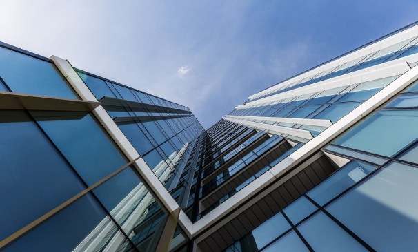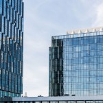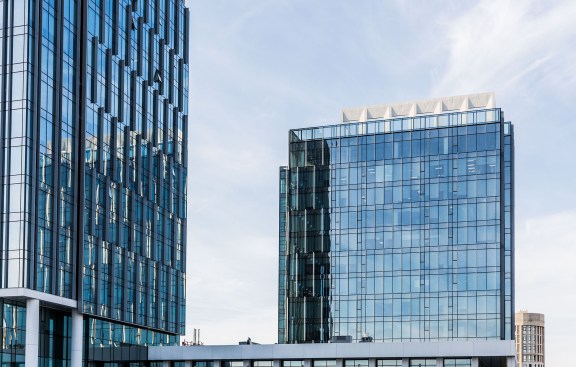 The color relationships of different tones of marble, carpet; contrasting linear rhythms of metal constructions; tinted glasses lining up in harmony; create a quiet world of modern man. Each zone has an independent language: noble grey contrast and a linear arrangement of golden metal hues on front glass allocate elevator hall; the reception area is represented in the concise system of black tinted glass decor. The zone of coworking is created predominantly by light warm tones.