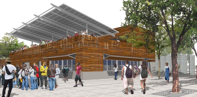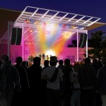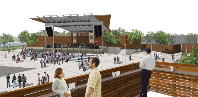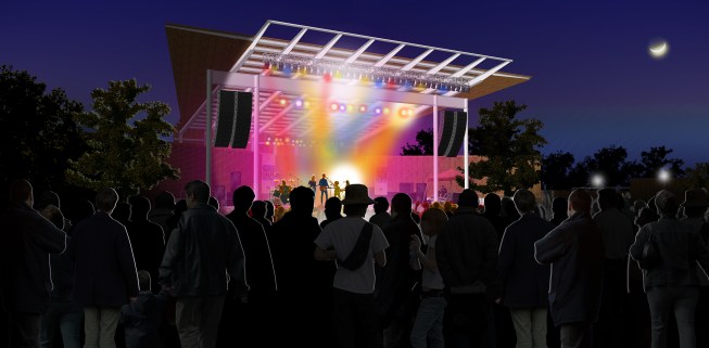 Designed with unique architecture employing warm, inviting materials and a high-quality directional outdoor surround sound system that will equal those of other Midwest venues, the performance pavilion establishes a cohesive environment that embraces and connects the venue to the neighborhoods flanking the Fox River much like a musician on stage connects with his/her adoring, loudly cheering fans.