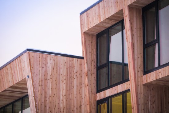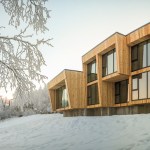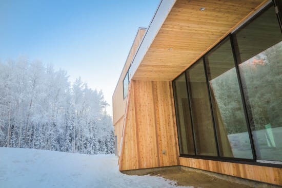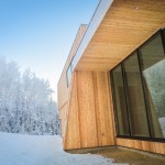 The Villa’s wood exterior, comprised of cedar wood cladding and soffits, fits contextually within the wooded landscape. Extreme climate conditions and a short construction season were prime considerations in developing the design, which incorporates a highly-insulated building envelope and high-performance, low-energy use systems.