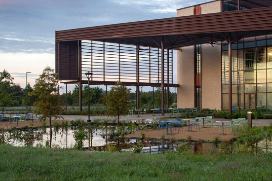 In keeping with ACC’s Sustainability Initiative, the campus is designed to and pursuing LEED Gold certification. In addition to transportation initiatives, the campus utilizes state-of-the-art HVAC and controls, LED lighting, and rooftop photovoltaic arrays. These strategies add up to an energy model 40% over baseline, with 9% renewable energy. The campus embraces water as a sacred resource, treating stormwater through innovative methods. Rooftop runoff is collected by cisterns that punctuate a student courtyard space. Site runoff is captured in rain gardens defining the landscape. Integrated into street landscaping and courtyard design, the rain gardens support the endangered Monarch butterfly along its migration.