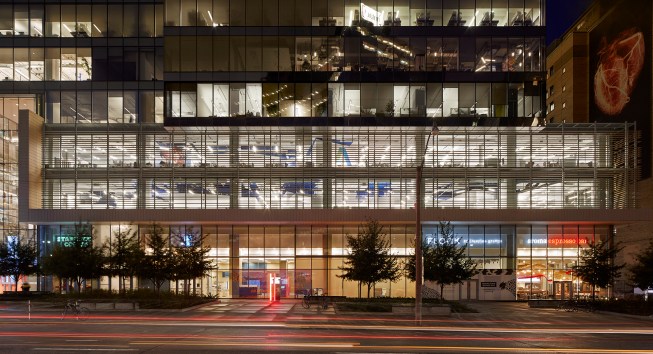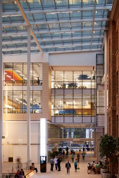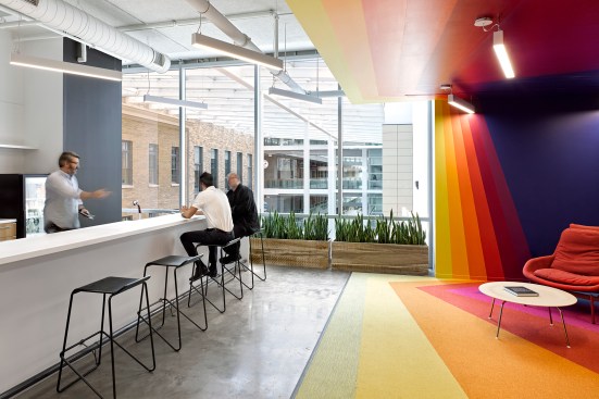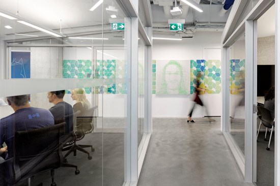 The team chose one design alternative to use as a baseline for refinement, tweaked it based on late-stage feedback from employees, and chose finishes and graphics, evolving the scheme into the one that was actually built out. “We’re not purists about using computation to optimize objective efficiency,” Benjamin says. “We thought, ‘This is a system that could help us manage a lot of complexity, and we’ll see how far it can take us, and then we’ll see if there are other things we have to do to get us to the point that it’s a great design.’ We’re not saying computation is always better, just that it’s another way.”