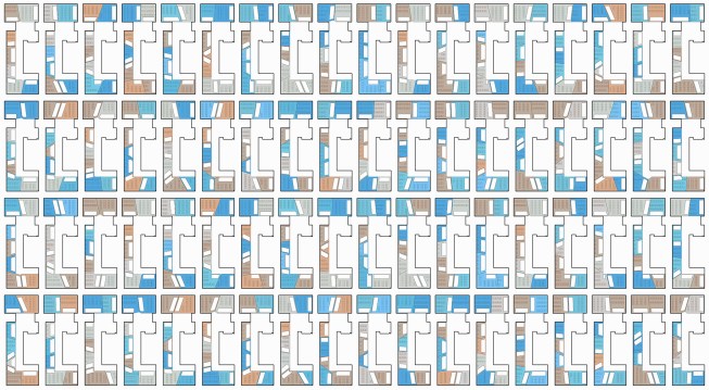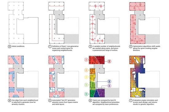 Each goal had its own algorithm. These were run through another algorithm that “evolved” the designs, creating 10,000 possible layouts for the space, each with a measurable outcome for each goal.