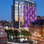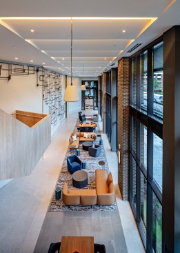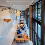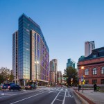 Active retail plazas anchor both the northern and southern ends of the building, encouraging pedestrian connectivity across Fleet and President streets. Carefully located ramps and wide, welcoming stairs mediate the elevated ground floor level required by flood plain regulations. A long, wood canopy connects the main entry on the northern plaza with a secondary entry to the south, while also celebrating the important President Street façade and defining the lobby program. A similar canopy marks a third entry on Albemarle, which is used for the vehicular drop-offs and pick-ups that the heavy traffic on the other three streets precludes.