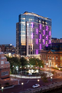 The prominent Western façade fronting President Street commands unparalleled views to the Inner Harbor. An elegant brick skin, which refers to the masonry grids of Harbor East, is framed by glass towers on the northern and southern ends of the building, terminating the important visual axes of President, Eastern Avenue and Fleet Street. The glass façade is also used to express the three penthouse levels and provide unimpeded views of the historic waterfront neighborhood.