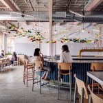 Light fills the space—both from large windows out to the street and into the skylit brew house, as well as from the pendant light fixtures that create a plane below the ceiling. The white concrete block walls are offset by pink-painted exposed structural steel, gray felt runners applied to the walls that serve as acoustical control, and colorful murals by local artist Madison van Rijn. A series of nonstructural wood frames help define seating areas and “play with your sense of scale,” Lee says. “When you have repetitive members that keep stretching and reinforcing the receding line, the space looks bigger.”