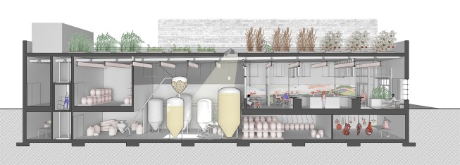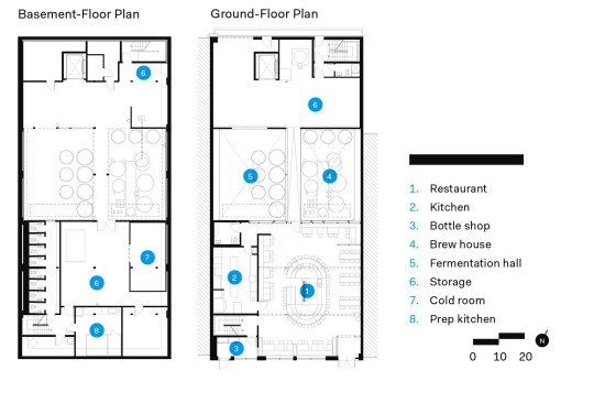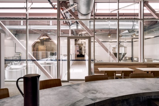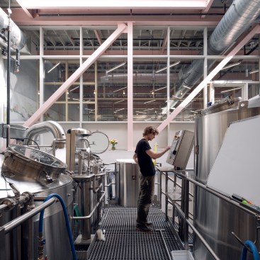 The biggest challenge for the LAMAS team, led by principals Weihan Vivian Lee, AIA, and James Macgillivray, was reconfiguring and expanding the structure—all within the existing footprint. The basement was excavated to accommodate a full lower level, and the floor in the center of the structure was removed to create a double-height brew house. Throughout, the structural steel was doubled to accommodate the modifications.
