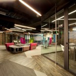 Diffuse light cabinets were especially designed in the form of an “X” representing the company, placed randomly in meeting points with decorative lamps of warm light to generate comfortable environments. The image in general in the design of carpets, panels and furniture creates an energizing atmospher.