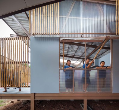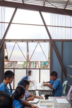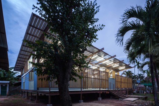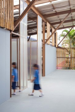 The building is designed to correspond with the weather condition of the northern part of Thailand which allows the circulation of natural air, and the penetration of natural light into the building. The characteristics of the building are required to be thin and light. Besides, the building is demanded to have pavilion-like appearance in correspondence with the rural architecture in which the ceiling is elevated in order to allow the natural light to penetrate through the classrooms during daytime, the air can freely circulate, the humidity in the rooms is reduced and the floor is also elevated in case of flooding. Furthermore, there is also the space for keeping the shoes according to Thai culture which requires the guests to take off their shoes before entering the main building. The Veranda, thus, is the semi indoor outdoor space which is appropriated for Thai culture and weather condition. The extended eaves can be provided as the weather shield; however, the air can also pass through the building facilely. Additionally, the number of the pillars and other components has also been diminished since the building is constructed by using the benevolence.