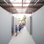 The school has requested for 4 classrooms with the utility space of 48 square meters; moreover, the central space is also required so the children can have their activity space. Additionally, the modular of the donated material utilization in the dry construction process is ideally managed in order to avoid the construction remainders. The structure of the building is mainly made by steel according to the principal condition that we had proposed since the steel structure would represent the flexible skeletal frame and this unrigid structure can also absorb the vibration when earthquakes occur. Besides, the steel structure can be constructed facilely and promptly in rural areas.