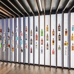 The design tells the Bacardi story. Materials, provided by local suppliers, reference different points on the Bacardi timeline—wallpaper behind the fully-stocked bar for Cuba; metro tiles for Italy and Martini and Rossi; Gaudi tiles, Miro-style pendant lights, and timber floors for Barcelona. A dedicated story wall adds annotation.