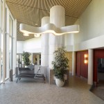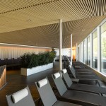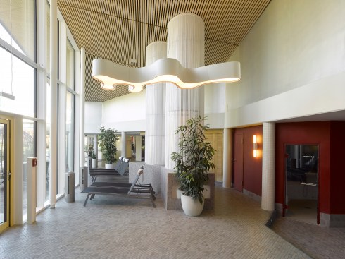 This two-story extension is a continuation of the original design concept of the main thermal baths building and inserts itself into the existing built context. The large expanse of the glazed façade permits a maximum sunlight and is similar in construction to the existing façade of the original building. Wood, concrete and tiles in the interior reflect the material theme of the original building and imbue the new addition with an atmosphere that is at once vibrant, bright, and cozy. Tiles used in the original building are also used in the new resting areas in order to create a natural bridge between old and new.