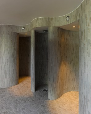 The extension is the central hub and passageway from which visitors can access the existing indoor and outdoor sauna areas, linking the old and the new buildings. It also represents the gateway to the new resting zone which features a timber construction that swings outward to embrace the annex in the south. Reclining beds populate the resting zone as well as along the west- and south-facing facades.