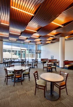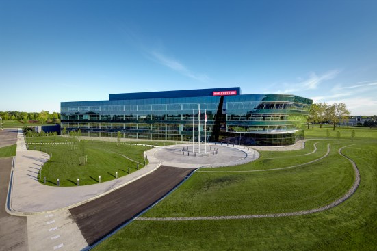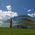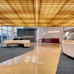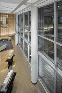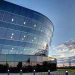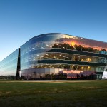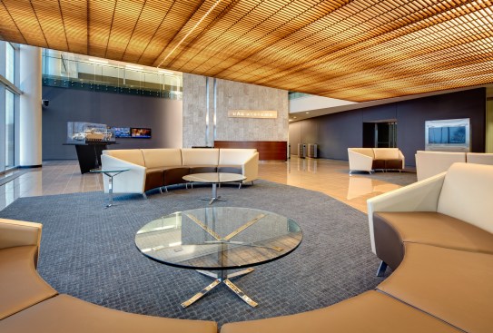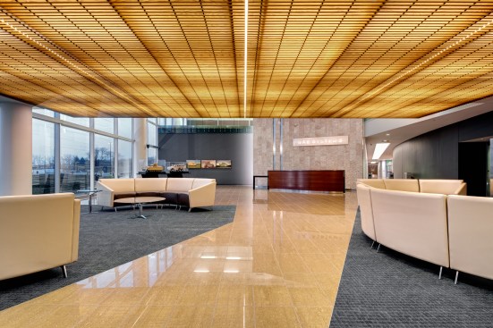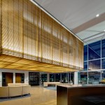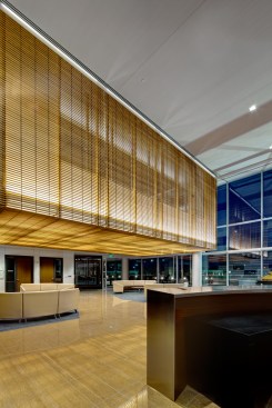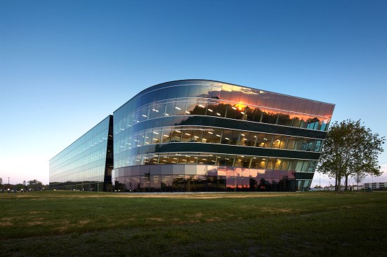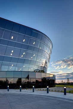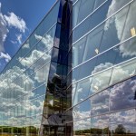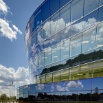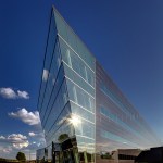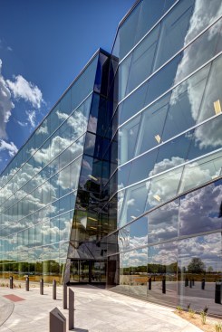 A strong physical architectural presence is a statement of their commitment to the local community. Siting the structure along an east/west axis provides benefits of orientation for sustainability, while canting the broad face toward a main seven lane thoroughfare increases visibility from the street. This skewed four-story, curved glass parallelogram is then canted toward the road to create a unique and commanding presence.