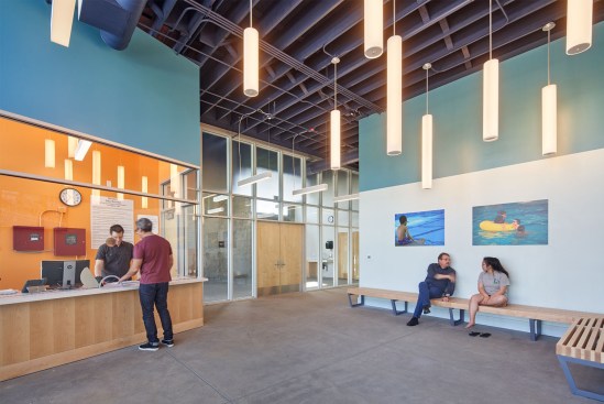 The design reaches LEED Silver – equivalent and increases the programming capacity of pool services by reconfiguring the locker rooms and administrative spaces, carving out space for a new community room. The building is more deeply connected to the suburban context by redesigning the parking area to improve traffic flow, drop-off area, and meet ADA compliance. A new civic threshold is created by defining a clear point of entry with a canopy and by integrating discreet landscape and lighting elements. Rebuilding the entry ramp and interior spaces allow for ADA compliance from the entry throughout the building. The rehabilitated pool preserves the qualities of the original 1957 building, while thoughtfully and respectfully adding to the building to make it a vital resource for the building to make it a vital resource for the community for years to come.