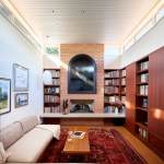 The design team discovered that Roessner’s original plans called for clerestory windows in the family room and on the south wall in the living room. They had been cut from the project due to cost, so these windows were re-instated during the remodel to realize the original vision and improve daylighting in both areas. In the family room the concrete hearth mimics the design of the iconic, cantilevered front balcony. The sliding cabinet doors were crafted to change the functionality from library to entertainment center. New sliding pocket doors with pocket covers designed to conceal the pockets when doors are open, were built to accommodate the new ceiling height. The original mid-century Herman Miller sofa and coffee table were restored, reupholstered and reused.