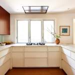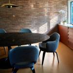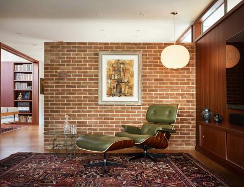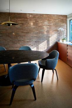 Inside, the original, open floor plan was preserved, though the connection between the kitchen and living was opened up to enhance spatial flow. Originally a large mahogany-wrapped central element broke up the kitchen and living room. This built-in was removed but inspired the new mahogany paneled walls used throughout the house. The removal of this load-bearing element required a new steel beam to be inserted in line with the rafters, and a new column to be set within the existing double-wythe brick wall on the west side of the dining room. Necessary updates included removal of asbestos tile throughout, installation of cork flooring in dry areas and tile in wet areas. New LED lights were found to match original.
