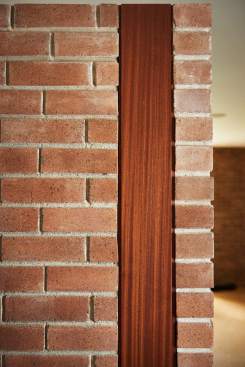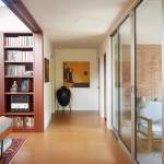 The original entry featured an open-air approach to the front door. The renovation enclosed this space to create a formal entry hall and to allow for more room to receive guests. The west brick wall, originally an exterior wall, now functions as an accent wall that divides this space from the living room. An inset piece of mahogany fills the recess at the location of the original wall with the front door, opening into the hallway. The ceiling height of the hall was raised as part of the renovation, and all HVAC ducting was relocated to the roof.