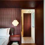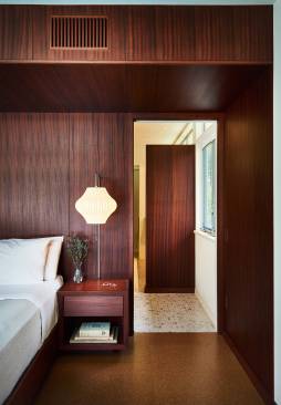 Originally a two-bedroom house, the bedrooms were combined as part of the renovation to create a single master suite. One side of the new bedroom is wrapped in warm mahogany, while the other has an expansive window opening up to the private courtyard and pool. Custom-cut mahogany return air grilles were crafted to align with the grain of the paneling, and the bed frame was custom-fit around the owners’ motorized bed. Period-appropriate Nelson sconces were paired at the bedsides.