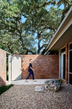 Extensive work went into protecting, salvaging and reusing as much of the original material as possible. Where existing brick walls needed to be removed, each brick was carefully salvaged, cleaned, kept for reuse and strategically placed in existing walls where repairs were necessary. New brick was matched to original. Many of the original light fixtures were saved and reused (exterior examples include the bullet-shaped fixture at the guest casita and the tall sconce at the entry to the courtyard). The iconic cantilevered balcony and railing on the front of the home were restored along with the original dry-stacked limestone wall below. To accommodate a heritage live oak, the roof eave overhang was notched. The exterior envelope was fully retrofitted, which included new insulation for the roof and walls as well as new, double-glazed windows. Photovoltaic panels were added above the carport and atop the guest casita behind the carport. A new landscaped walkway brings guests to the house from the street.