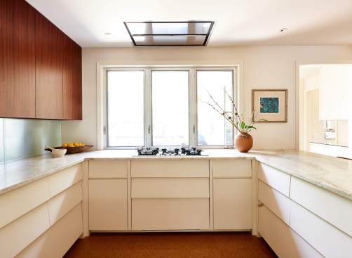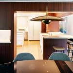 The kitchen, virtually unchanged since it was built, required significant changes to address contemporary needs. The most noticeable change was opening the kitchen to the adjacent living spaces, creating a new bar, and upgrading countertops with honed quartzite. Vestiges that remain from the original design include the wood wrap that defines the space, as well as a small, sliding glass pass-thru between the kitchen and dining room. In the dining room, the slant-front drawer design was original to the house but due to the extent of construction it was unrealistic to salvage the cabinets. The same layout was reproduced in the new mahogany cabinets to keep the original design. The insides of these cabinets were then able to be customized to the new owners’ needs.