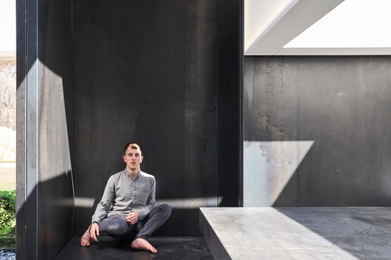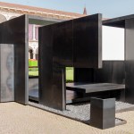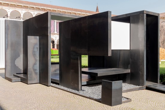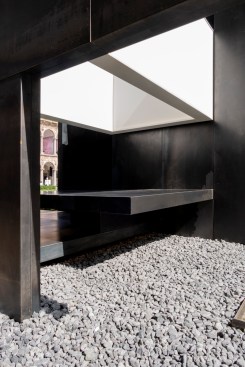 The 4-meter-tall pavilion floats above a shallow reflective surface and is created using raw steel to emphasize the pavilion’s sculptural qualities. The raw steel was also chosen for its organic texture and the rich, varied appearance of its dark warm tones under natural and artificial lighting conditions.