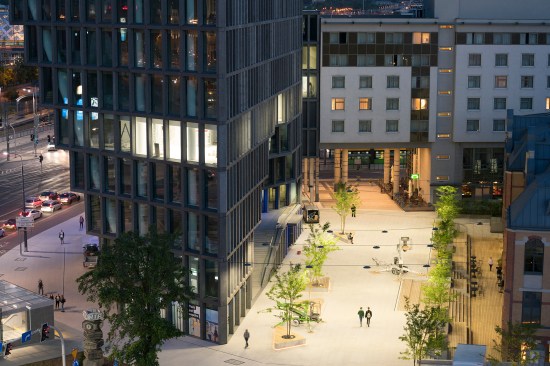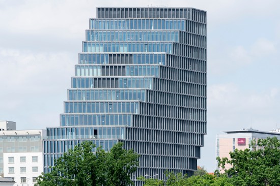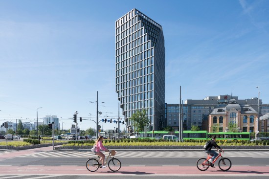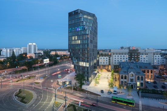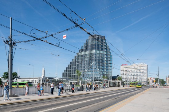 Baltyk appears totally different depending on what side it is approached from. A linear building with a concrete, entirely glass-fronted facade and clearly exposed aggregate grain, sets it apart from its surroundings and is an example of a balanced combination of "old" and "new" architecture in the context of the neighboring historic building of Concordia Design and the Haven. Occupying 16 storys with an irregular arrangement, and towering over the city center of Poznan, the building changes its shape depending on the viewing angle. This 25,000m² building is divided into 12,000m² office space, 750m² panorama restaurant with a one room hotel, 1350m² retail in the plinth of the building and three levels of underground parking. The flexible office space is limited to a depth of seven meters allowing daylight to generously penetrate the work spaces. Baltyk is also a multi-functional building with innovative interior solutions, and scenic terraces offering panoramic views all across the city. In addition to business-oriented functions, the building will house catering establishments, a fitness club, and an intimate jazz club on the 16th floor. Its close proximity to the reopened Concordia Taste restaurant and Haven square creates social functions that encourage meeting and integrating different communities. This results in a form which appears completely different depending on the angle it is approached from. Towards the south, a slope of cascading patios offers outdoor spaces to the users of the building. The facade is floor-to-ceiling glass with vertical louvres of glass fiber concrete softening the impact of the sun without losing the vistas over the city and zoo.