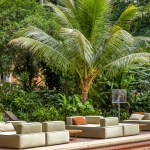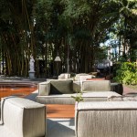 ◼ Lounge. A large deck in ecowood was placed around the pool, with areas for sofas and tables for bam’bo͞o bar 箂 patrons. Employing the surrounding hues, Gisele Taranto created a palette especially for this space, in the green