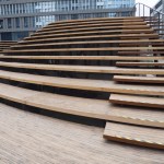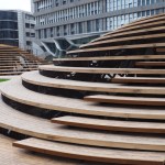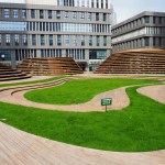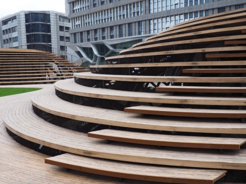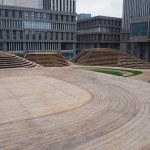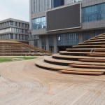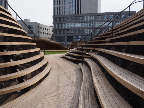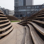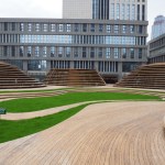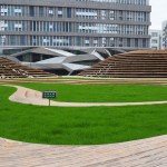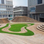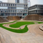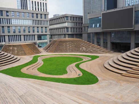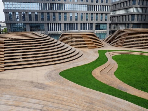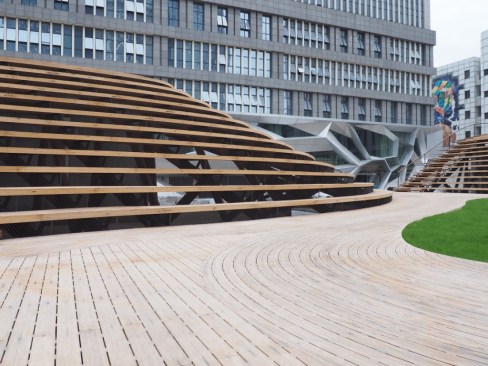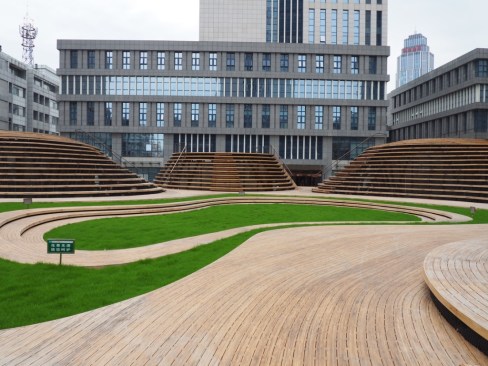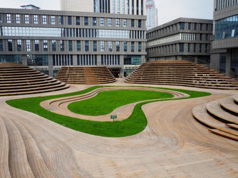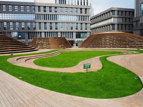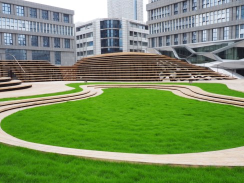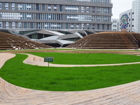 In fact, the design of Bamboo Square is fully adapted to its surroundings. Originally, the space was a flat concrete block with six unsightly entrances to an underground parking lot protruding from it. The parking lot still exists, as do the bulky entrances to it, but they’ve since been transformed by Li into six “hills” of bamboo, each of which can be climbed via wraparound bamboo steps and provides a birds-eye view of the landscape. In the middle of these six bamboo hills, the focal point of the square is a large oblong-shaped swath of grass resembling a giant green footprint, bordered by circular tracks of bamboo that rise to an outer ring of grass. It’s the perfect spot to have a picnic or romp around with friends in the middle of the hustle and bustle of the city.