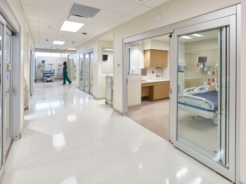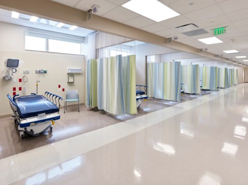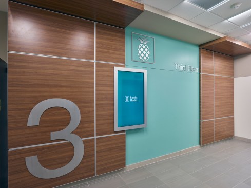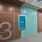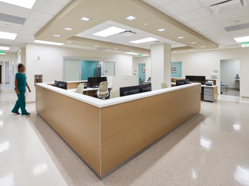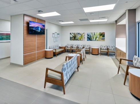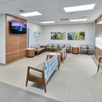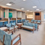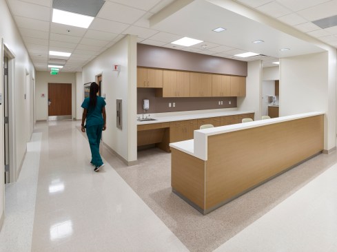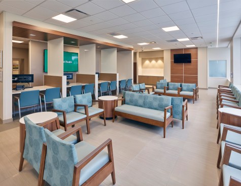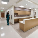 Color-changing exterior lights increase visibility from the adjacent interstate, while modern metal panels and curtain wall glazing reflect the high-quality care patients can expect to receive inside. The color and tile patterns not only provide visual interest, but they also aid in wayfinding. The facility’s neutral, warm palette is accentuated with pops of blues and greens, with each floor having a specific color scheme.