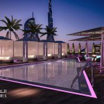 Lounge and bar concept design with outdoor pool and cabanas located on the top floor of high rise building.