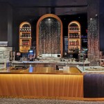 The bar’s back wall features wall-to-wall mirrors, both straight and curved. Mirrors used for the bottle shelving are individual pieces of glass that precisely follow the curve of the walls.