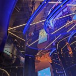 Custom colored fuchsia annealed laminated mirror glass with “V”- grooved carving is part of the lounge seating area. It contrasts with the surrounding dark blue substrates to add intrigue and beauty.