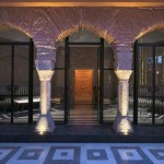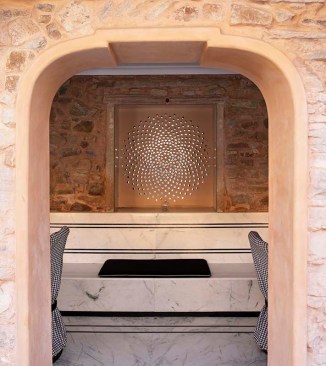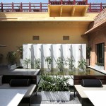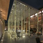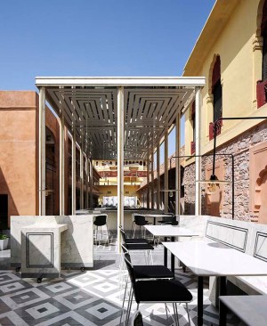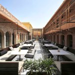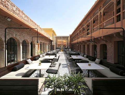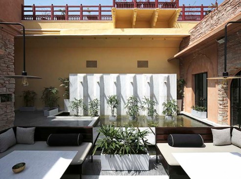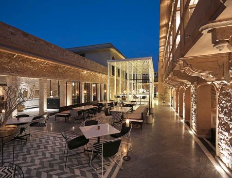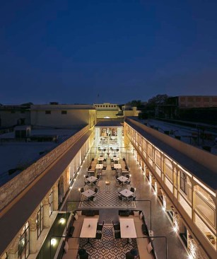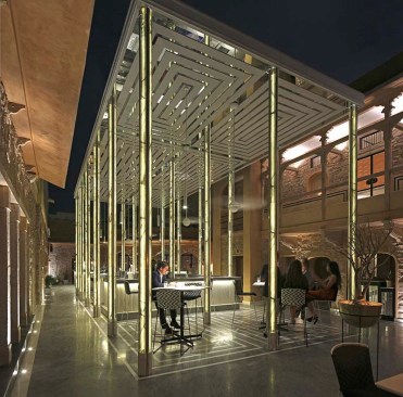 From structure to flooring to furniture units, stone masonry and inlay work have been given new expressions. The skilled artistry of local craftsmen in marble is given a graphic vocabulary for flooring, the Pavilion, dado work, benches, table tops and more. Housing the island bar, the contemporary Baradari-inspired Pavilion is built using metal, fluted marble and mirror heightening the historic vocabulary of the existing buildings. Marble benches line the deep verandahs enveloping the courtyard to create intimate dining spaces. Mild steel and brass are used for bespoke lighting and door design.
