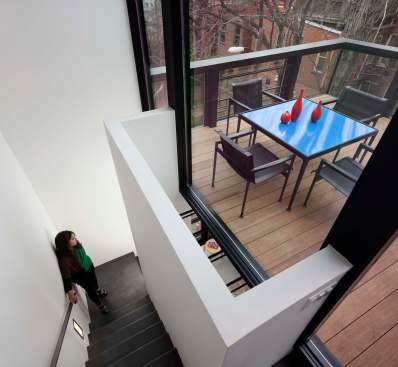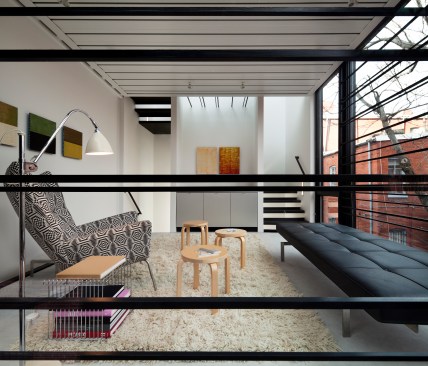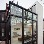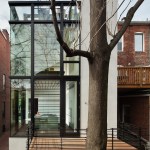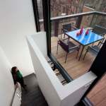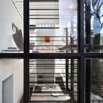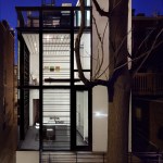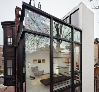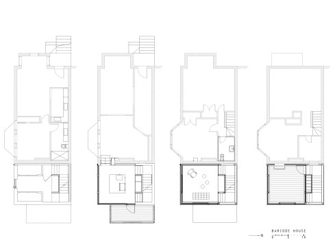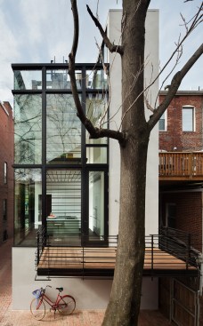 Barcode House explores juxtapositions between the heavy and light and the old and the new. The work is formed by positioning the project’s diverse pressures into a unique situational aesthetic. Brittle masonry walls of the existing Washington, DC row house governed that the addition be engineered as a freestanding structure. Site constraints dictated a vertically oriented spatial solution. The client’s desire for transparent living space generated the opportunity to create an integrated solution for lateral force requirements. Structural steel rods within a glass window wall are aligned with datum lines of the neighboring building elevations. A stucco circulation tower anchors the living space to the existing row house.