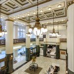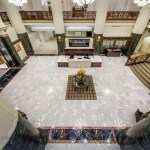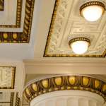A new VAV mechanical system is discretely hidden above new ceiling “clouds.” Cut outs allow historical elements to be featured through the use of color and light as they are highlighted against the neutral palette of the surrounding walls, ceilings, and bulkheads. Original light fixtures on the ceiling beams and decorative sconces on the columns were refurbished to utilize LED lamps. All new light fixtures throughout the spaces utilize LED lamps.