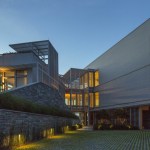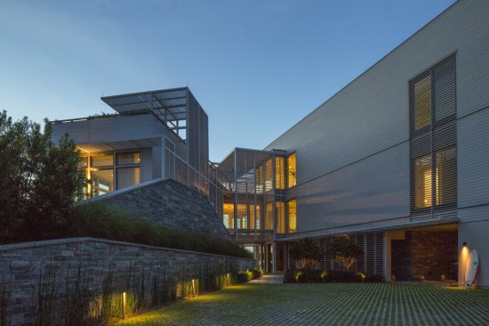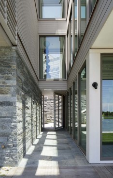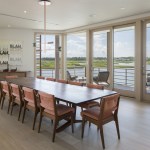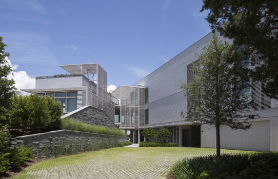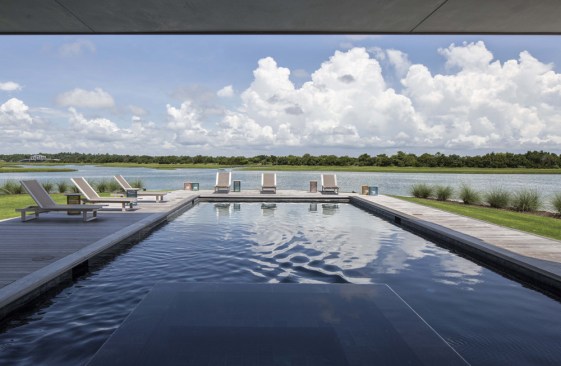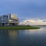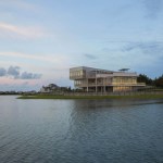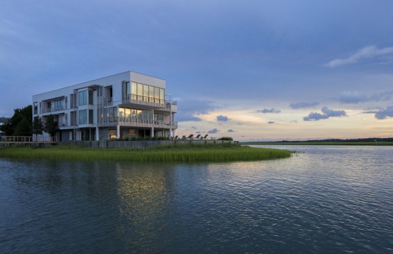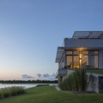 This summer retreat complete with 270 degree views is sited on a peninsula jutting into marshland and inlets off of the Intracoastal Waterway outside of Wilmington, NC. A modern aesthetic works to create a casual feel with playful circulation patterns and careful integration with the surrounding landscape. Composed of two interlocking volumes, the layout features open and permeable living spaces juxtaposed with more private bedrooms and guest quarters. The exterior is composed of natural cedar siding and latticework screens that provide the green roof, elevated terraces and glass enclosed living rooms, protection from the sun.