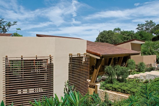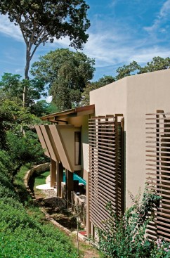 The Bartlett Residence was designed as a luxury vacation home in the middle of a dry tropical forest area. The property has a long and narrow building envelope area (limited by the development), that works parallel to the slope of the land, which is a fairly constant natural slope of around 30 to 35 degrees, forming into a natural ravine in the middle of the buildable space.