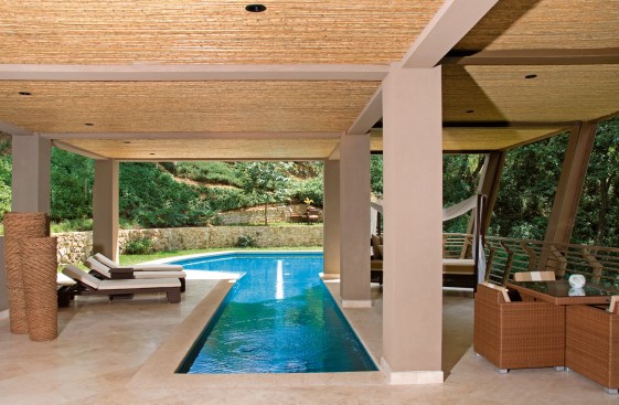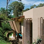 Due to the slope and building envelope location, the home was designed elevated off the ground on the slanted columns, and the social areas and master bedroom suite were located on the upper (entry) level, where the jungle view and distant ocean view was best, and the guest bedrooms along with the outdoor covered living area on the lower level. The latter space was designed to integrate with the swimming pool, which features a swim lane under the structure of the house, and therefore providing both covered and uncovered areas inside the pool.