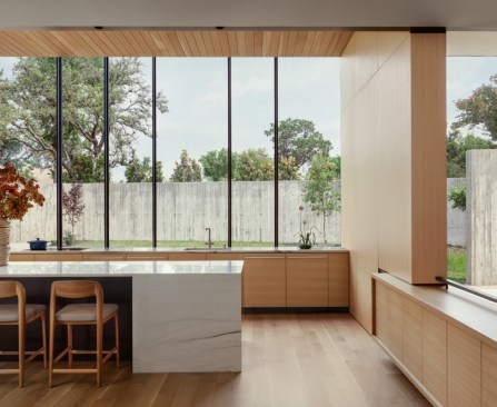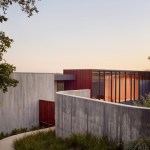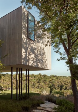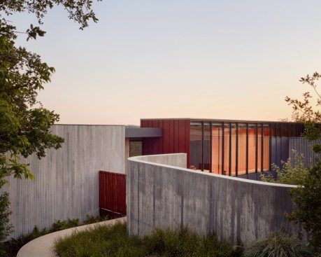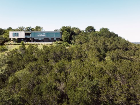 Built on a central Austin hilltop, this nearly-5,400-square-foot home for a young family holds surprises, both inside and out. Upon arrival, visitors round a sculpted concrete wall enveloping an interior courtyard, in the process getting a sneak peek of what’s to come, before reaching the entry to the house. Once inside, the spectator is greeted by a wall of floor-to-ceiling windows that command sweeping views of the Barton Creek greenbelt, a popular destination for local outdoor enthusiasts.