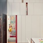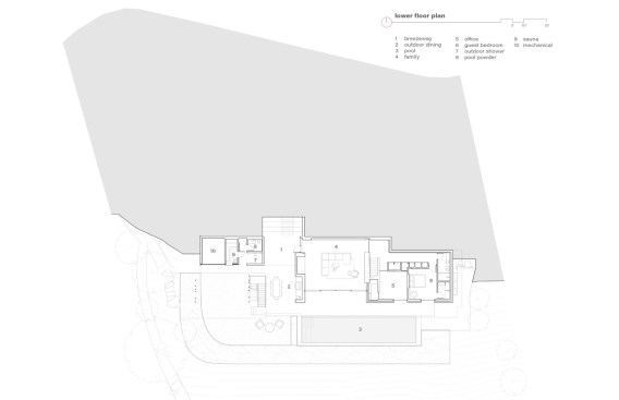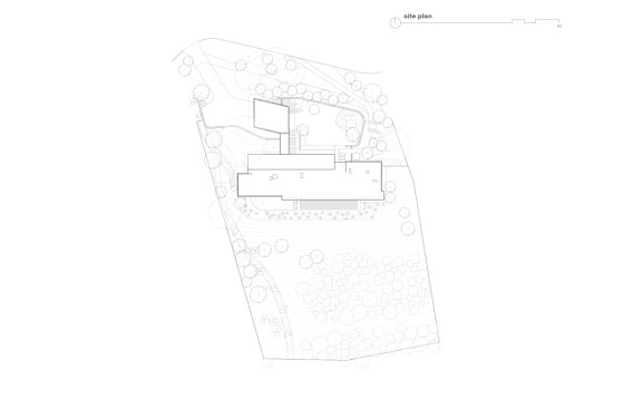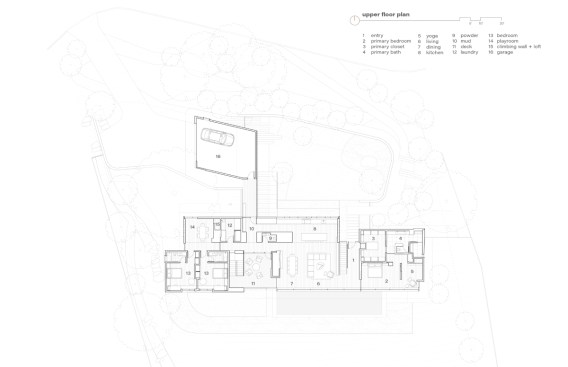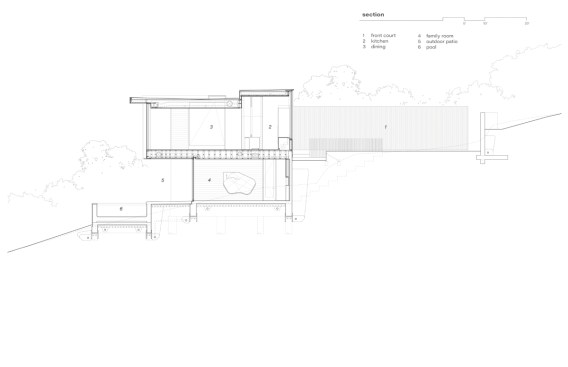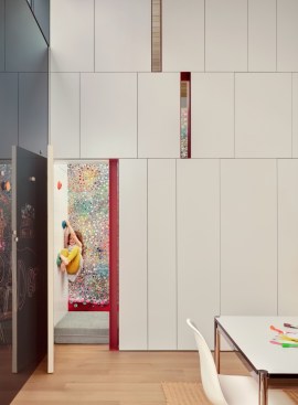 As the family includes two young children, the clients desired a home that would facilitate creative, self-directed discovery and low-tech play. To that end, the architects created a playroom with a secret: slots within the room’s wall reveal a hidden double-height space accessed via a jib door and containing a climbing wall. At the very top, the climber is treated to another vantage point looking northward through clerestory windows. They also carved out a sinuous double-sided reading nook within the concrete wall of the lower floor’s family room, a space which opens onto the swimming pool.